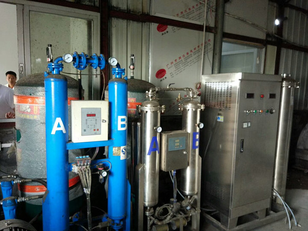 氣源的選擇要結(jié)合臭氧發(fā)生量、場地條件、能耗、運行管理、維護等因素綜合考慮。臭氧發(fā)生器的氣源為空氣或氧氣。采用空氣為氣源時,由于空氣中含有較高的水分和灰塵,不僅影響臭氧的產(chǎn)量,而且會破壞介電體,因此需對空氣進行除塵和脫水干燥,但省去了氣源費用。以氧氣為氣源時,相比空氣氣源,耗電量小,節(jié)省動力費用,占地少,但購買氧氣也增加了運行成本,并且需經(jīng)常更換氧氣瓶,日常管理麻煩。考慮到電力供應(yīng)充足,消毒間比較寬敞,工程選用空氣為氣源。